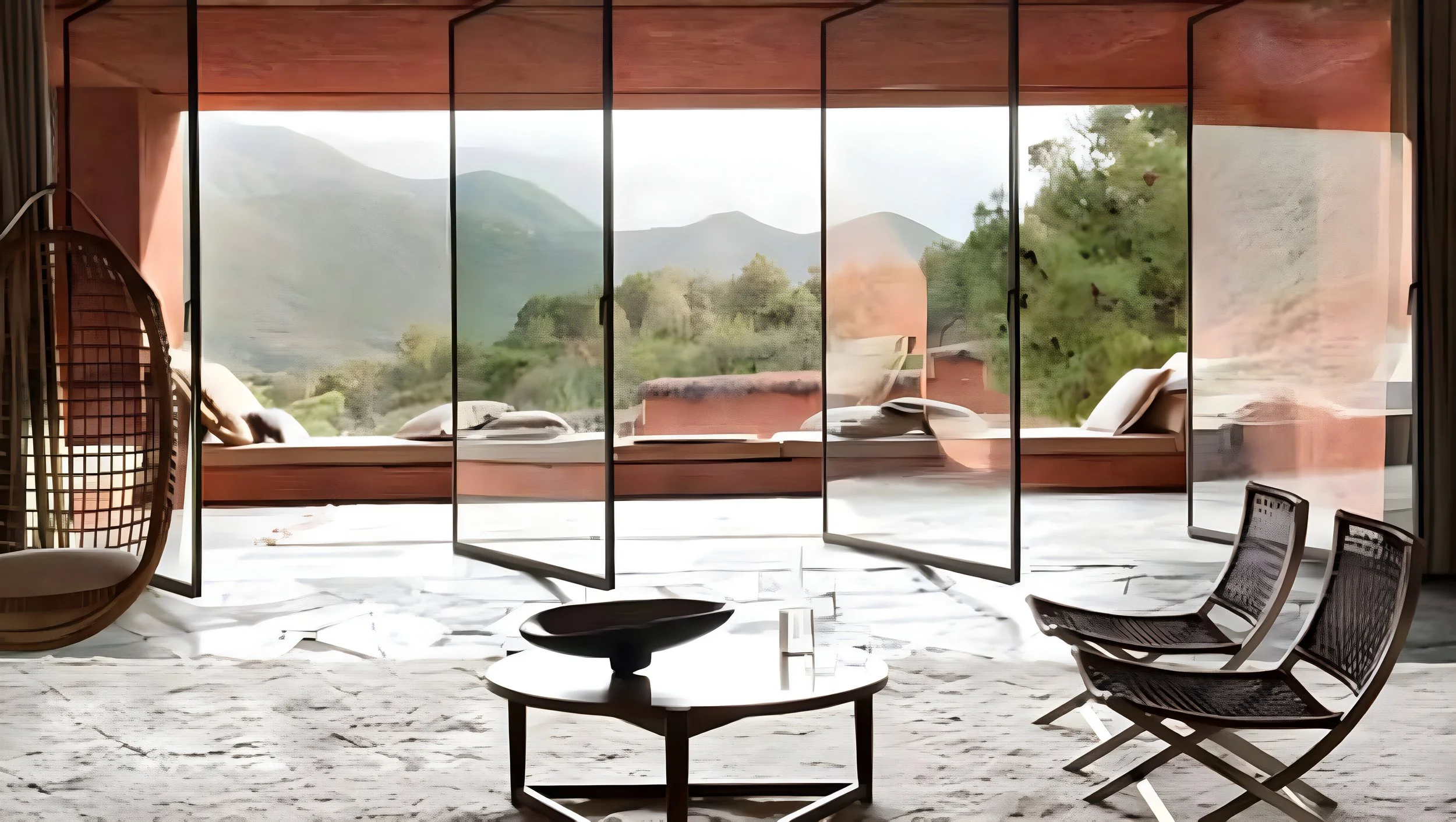 Modern living room with large glass doors leading to mountain view, featuring a hanging chair on the left and two wooden chairs on the right, with a round coffee table in the center.