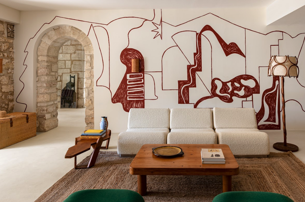 Living room with white sectional sofa, wooden coffee table, floor lamp, wall art with abstract red line drawings, stone archway, and vintage chest