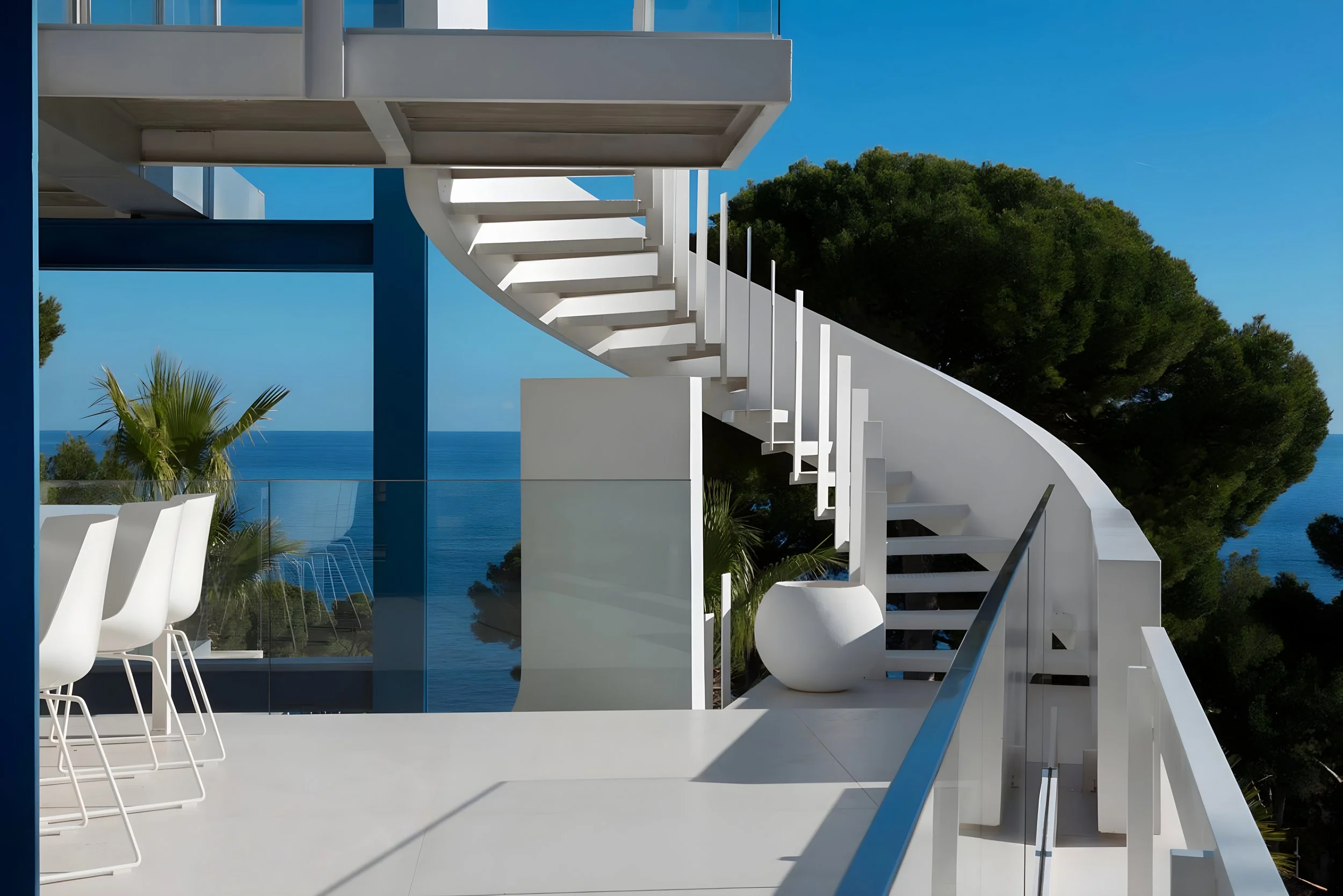 Modern white outdoor staircase with curved design on a balcony overlooking the ocean, with glass railing, green trees, and a clear blue sky in the background.