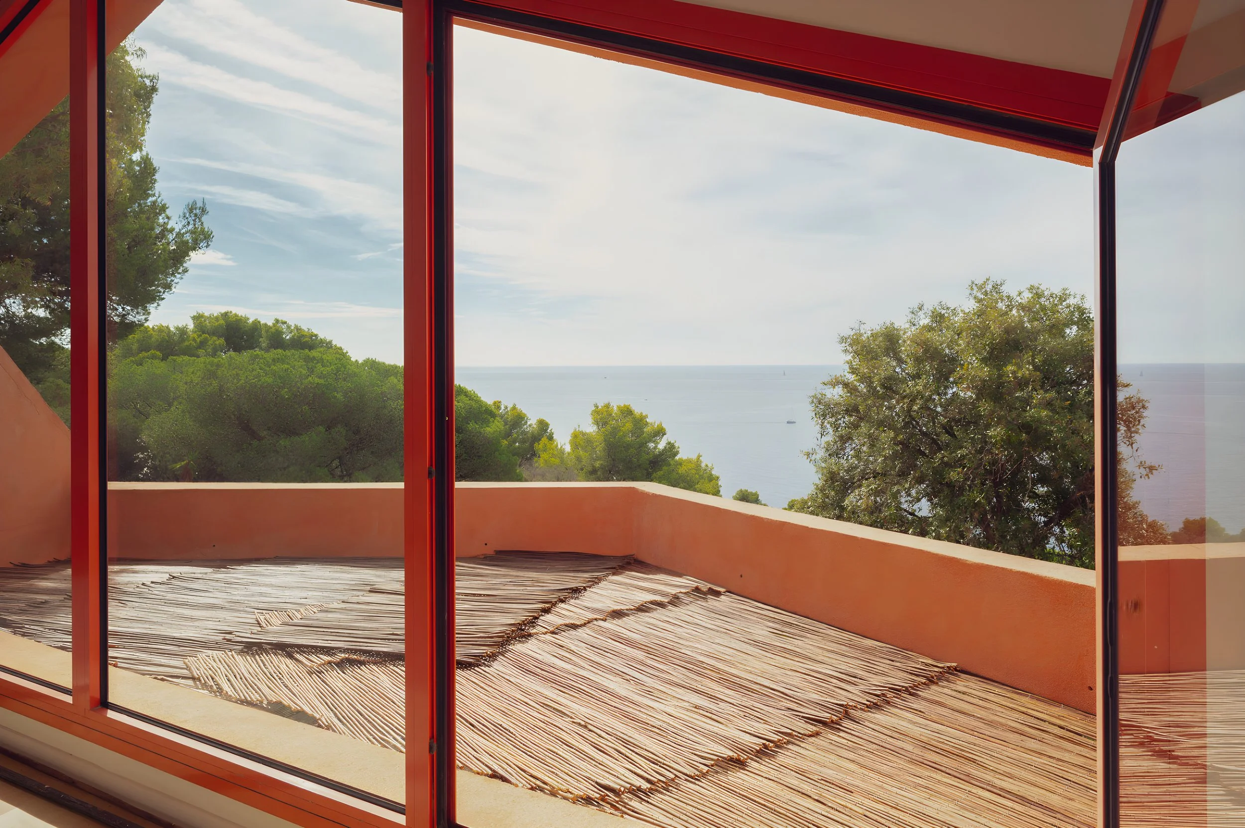 View from inside a room through glass sliding doors showing a balcony with a bamboo mat, surrounded by green trees and overlooking the ocean under a partly cloudy sky.