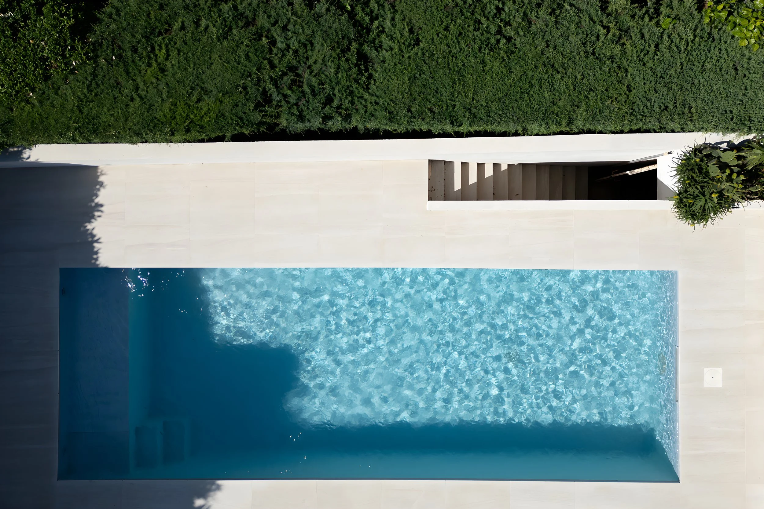 Top-down view of a modern rectangular swimming pool with clear blue water, adjacent to a white tiled deck, and a green hedge wall with a stairway and plants at the corner.